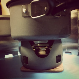 Ok this picture has the windscreen, a coaster, alcohol stove and the pot. Windscreen is effective, have that air intake below. The reason why i added the windscreen, knowing the alcohol stove does have a windscreen included is that sometime the wind blows hard and simply passes through this gap as you can see. 11:29 minutes to rolling boil 3 cups of water.