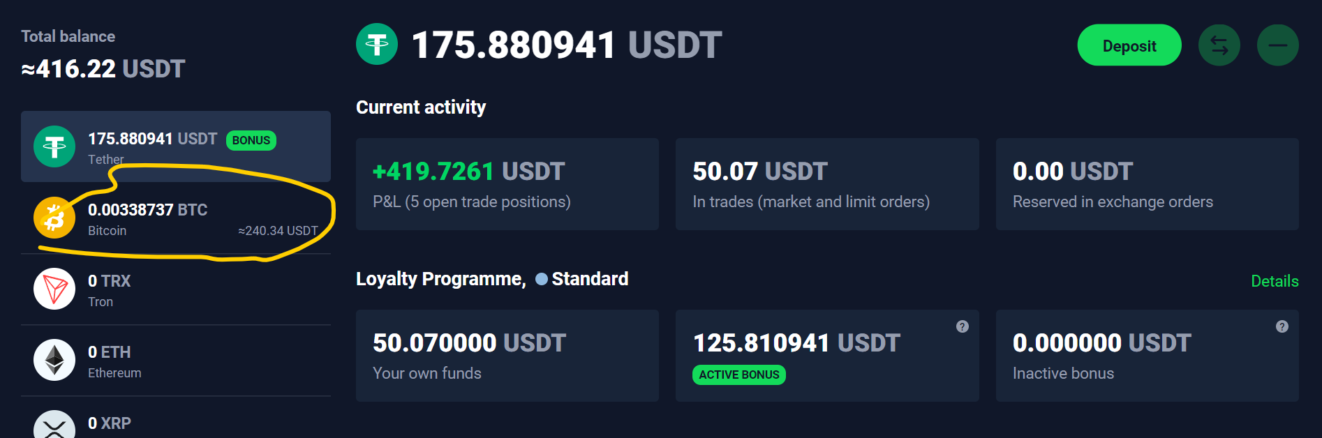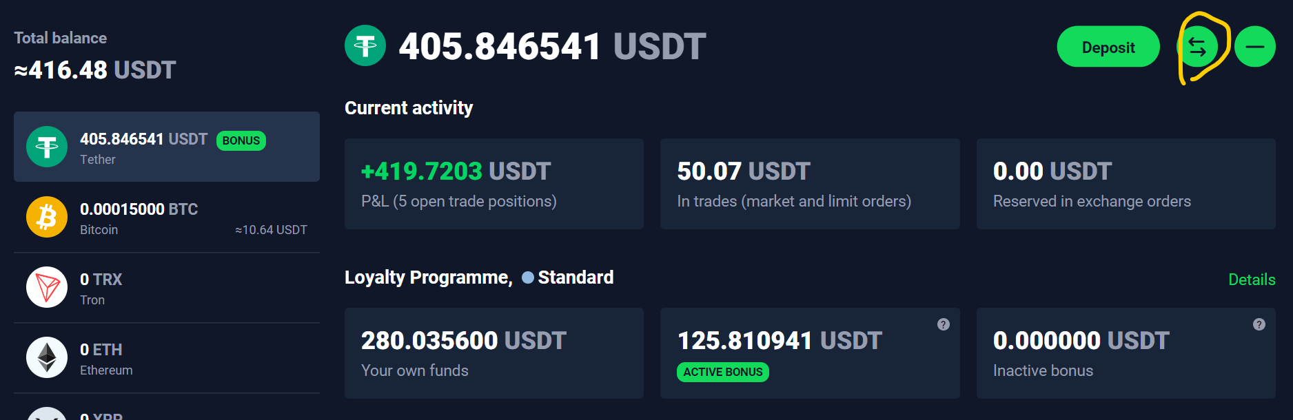 After closing the trade, you will see that it has been credited in my stormgrain.com wallet, 200+ usdt in the loyalty programme after charging commision. Then we can convert this to btc by clicking on the convert icon on the top right side.